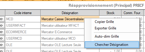 Vos listes de propositions de réapprovisionnement générées automatiquement par Mercator peuvent parfois être longues et conséquentes. Un simple clic-droit > Chercher sur la colonne souhaitée vous permet de retrouver facilement l'information parmi toutes les lignes.