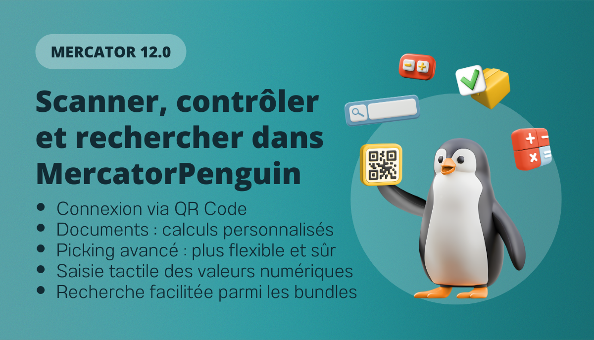 Connexion par QR Code, calculs personnalisés, picking amélioré, saisie tactile des valeurs numériques et recherche dans les bundles viennent enrichir MercatorPenguin.