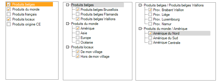 Ainsi, dans l'exemple ci-dessous, l'utilisateur ayant sélectionné la valeur "Produits belges" dans la catégorie 1, on lui propose les valeurs "Belges bruxellois // belges flamands // belges wallons" dans la catégorie du niveau inférieur.
