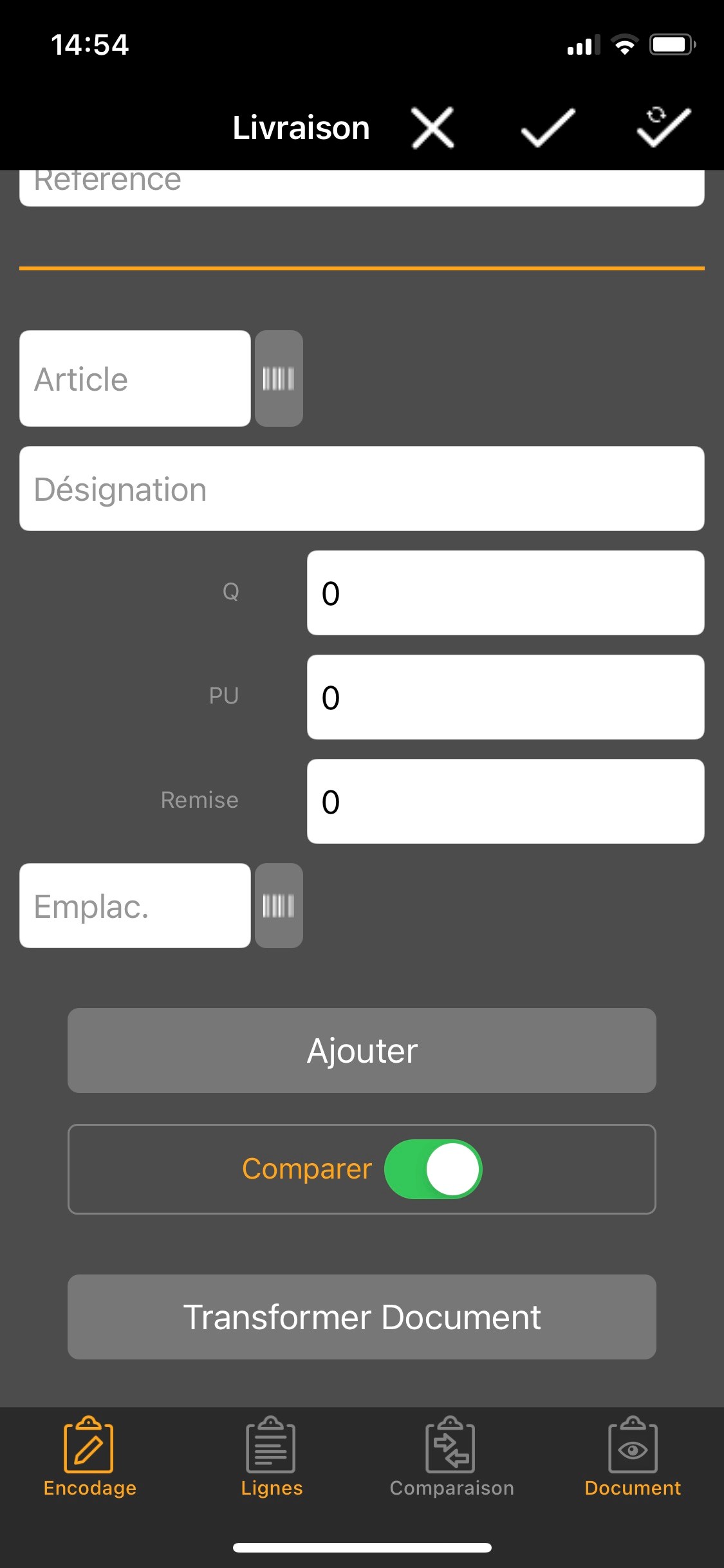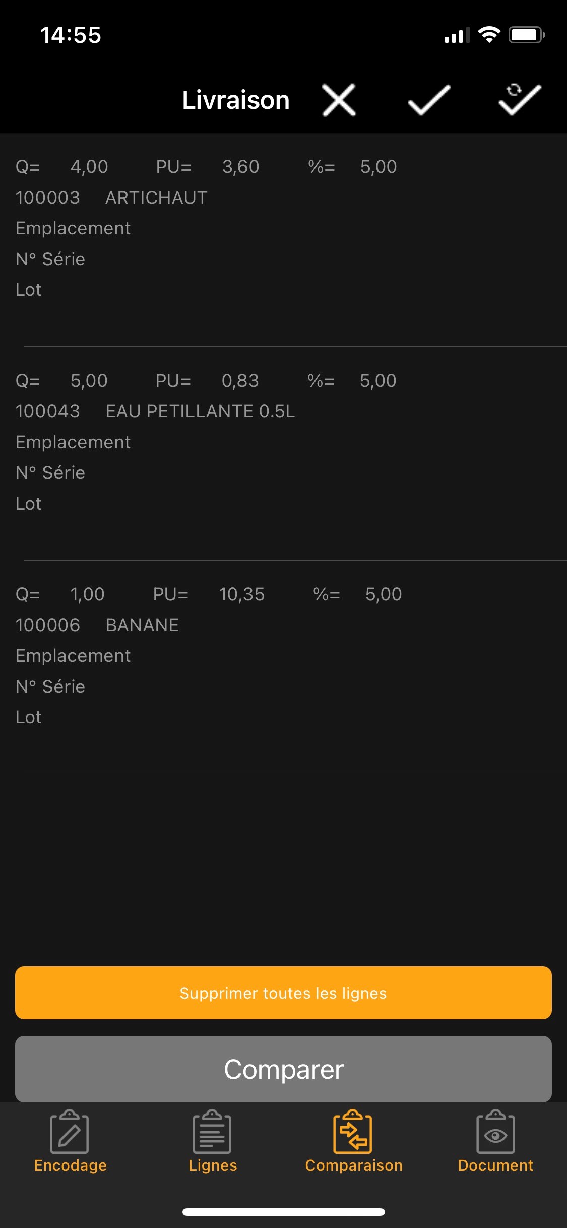 Vous pouvez aussi choisir de conserver toutes les valeurs du document d'origine ou toutes les valeurs du document de comparaison. - Après avoir terminé de corriger les lignes présentes dans votre comparateur, vous sortez du mode "Comparaison". Le document de livraison est alors adapté, il n'y a plus qu'à l'enregistrer.