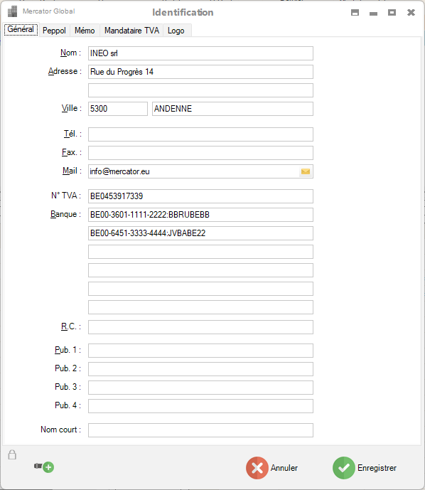 Ce point de menu "Outils > Identification" permet de fixer les coordonnées générales de la société.