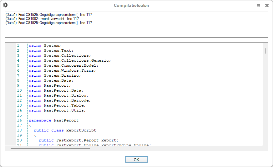 Het ontwerp van een FastReport-rapport resulteert in de generatie van C#-code die gecompileerd wordt. Voor versie 12.0.37 van MercatorReporting.dll kon deze compilatie een foutmelding opleveren die doorgaans geen verband hield met de werkelijke oorzaak.