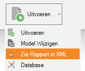 In de parametrering van de vrije documenten is het mogelijk om het rapport (repx) eenvoudig te bekijken in XML-formaat. Dit kan via het element "Zie Rapport in XML" onder de knop "Uitvoeren".