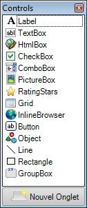 - Toolbox Controls : sélection des types de contrôles à placer sur l'écran à paramétrer