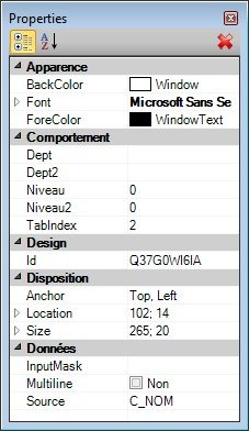 Cette fenêtre reprend l'ensemble des propriétés paramétrables pour le contrôle sélectionné. Dans l'exemple ci-dessus, il s'agit d'un TextBox. Les propriétés affichées dépendent de l'objet sélectionné..