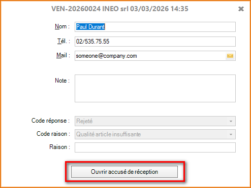 👉 Les accusés de réception sur réponses émises sont associés à cette réponse. Dès que cette association a été effectuée, un bouton supplémentaire est visible dans le bas de la réponse : "Ouvrir accusé de réception".
