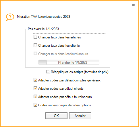 sont décochées. En effet, les taux de TVA dans les articles, clients et/ou fournisseurs ne doivent être changés que le 1/1/2023.