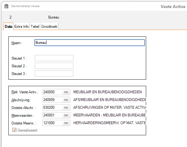 - De pagina Data laat toe het actief een naam te geven en de gekoppelde boekhoudrekeningen in te stellen: