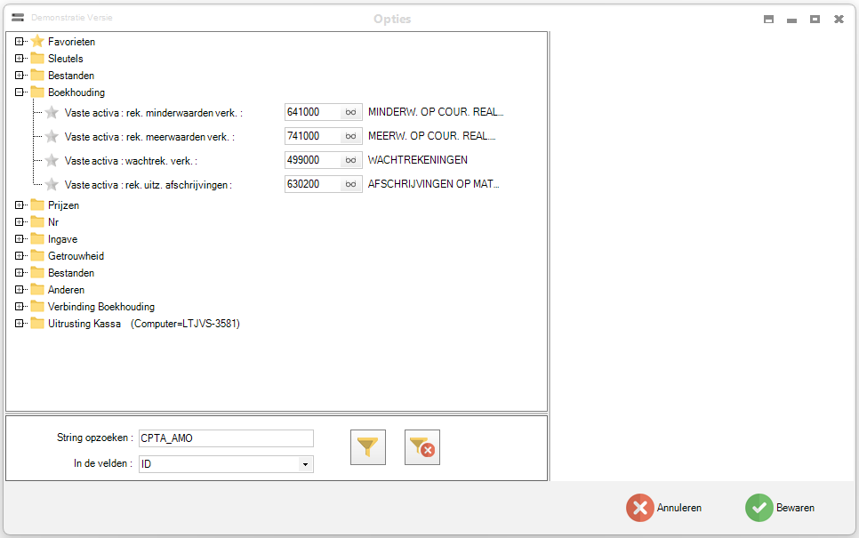 Bepaalde standaardrekeningen moeten worden ingesteld in "Tools > Opties" (ID = CPTA_AMO).