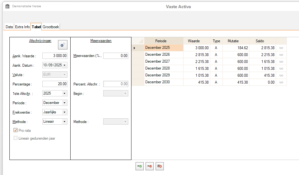 - Methode : afschrijvingsmethode (lineair, degressief). Let op: in België is de degressieve methode fiscaal niet langer toegestaan.