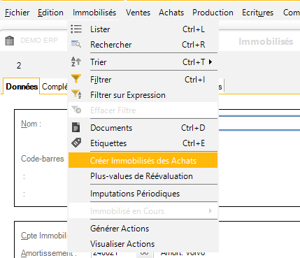 Dans le menu contextuel (ce menu est actif en fonction du signalétique dont la fenêtre est active) des fiches d'immobilisés, vous disposez du menu "Immobilisés > Créer Immobilisés des Achats".