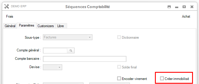 Il est également possible de faire en sorte qu’un immobilisé se crée dès qu’un achat remplissant les conditions de l’immobilisation est enregistré (uniquement exploitable pour les investissements ne faisant l’objet que d’une seule facture). Pour ce faire, il suffit, dans les séquences d’achat, de cocher « Créer immobilisé » :