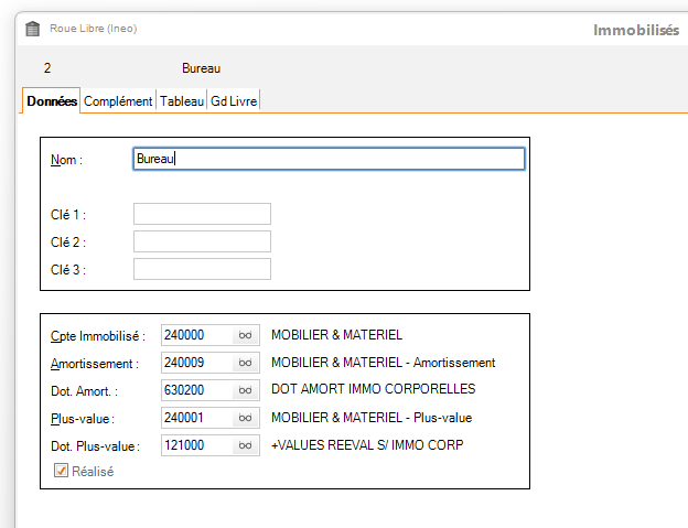 - La page Données permet de nommer l'immobilisé et de paramétrer les comptes comptables liés :