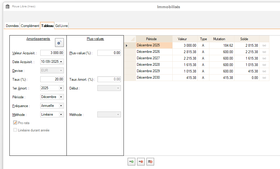 - La page Tableau vous permet de paramétrer les données relatives aux amortissements et de voir le tableau d'amortissement en découlant, ainsi que gérer les plus-values :