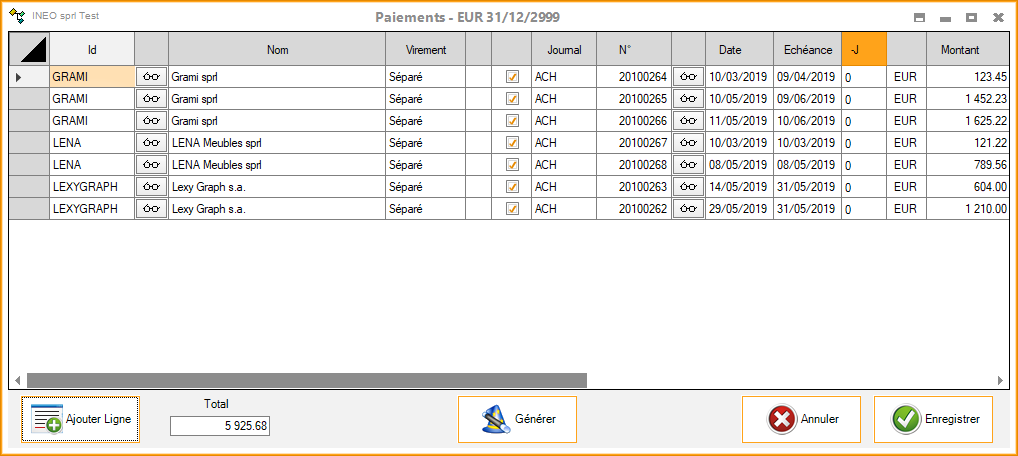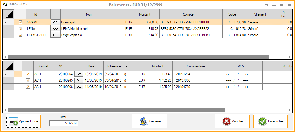 Par défaut, lors de la préparation des paiements, Mercator Comptabilité affiche deux grilles. La grille supérieure permet de sélectionner le fournisseur (ou le client, ou le compte général) et la grille inférieure affiche alors les paiements proposés pour ce fournisseur. Pour le traitement de grands volumes de paiements et/ou lorsqu'on souhaite adopter une stratégie de sélection des paiements prenant essentiellement en compte la trésorerie disponible et la date d'échéance des paiements à effectuer, il peut être utile d'agir directement sur tous les paiements à effectuer, quelque soit le fournisseur. Cette liste pourra être triée par échéance en cliquant dans le titre de cette colonne.