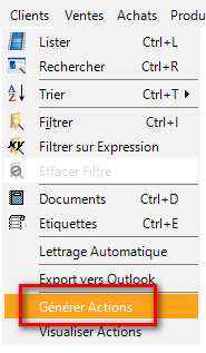 A partir de chaque signalétique, dans le menu correspondant à ce signalétique, se trouve une commande « Générer actions ». Ceci permet de générer une action pour l’ensemble des fiches de ce signalétique ou pour les fiches du filtre actif.
