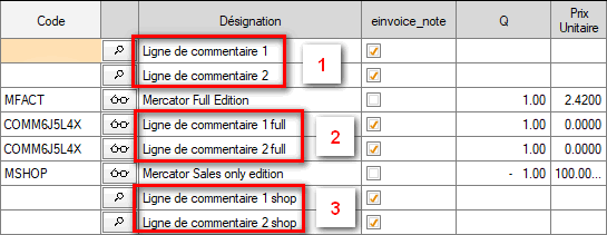Dans cet exemple, la facture au format XML contiendra 2 lignes (correspondant aux articles MFACT et MSHOP). Et les commentaires seront positionnés comme suit :