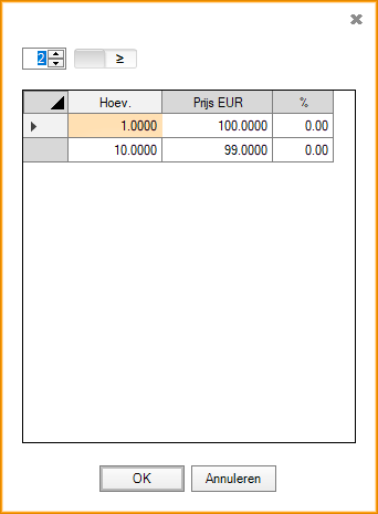 - >: de prijs wordt geselecteerd indien de hoeveelheid hoger ligt dan de aangegeven hoeveelheidsdrempel;