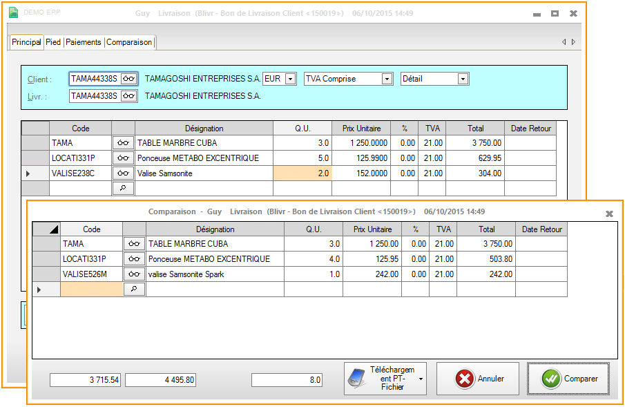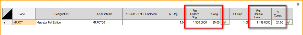 - Les boutons d'acceptation de comparaison reprennent toutes les informations d'un bloc. Il n'est pas possible de reprendre la quantité de gauche et le prix unitaire de droite.