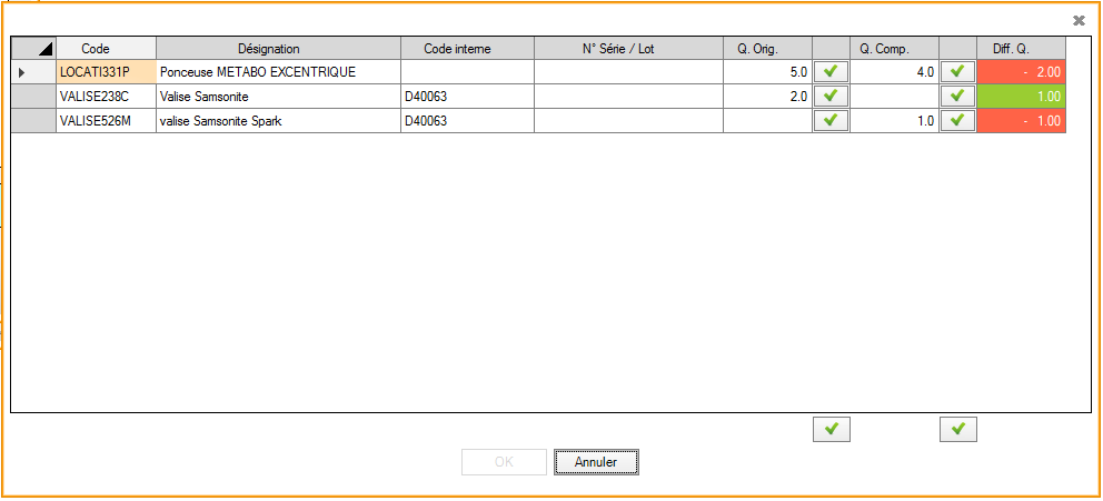 La validation du picking se fait par le V vert situé dans le coin inférieur droit de l'écran. Si les quantités saisies dans l'écran de picking correspondent au document original, un message avertit l'utilisateur et l'écran de picking disparaît définitivement. Dans le cas contraire, un écran de comparaison présente les différentes anomalies. Les boutons "V" situés à droite de "Q Orig." et "Q Comp." permettent respectivement de laisser telles quelles les lignes correspondantes dans le document d'origine ou de les modifier en fonction du picking. De la sorte, cet écran de comparaison permet, le cas échéant de