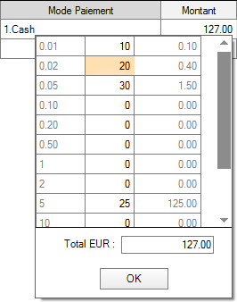 Mercator permet de mémoriser le comptage des coupures, càd le nombre de pièces et de billets saisis dans cette interface :