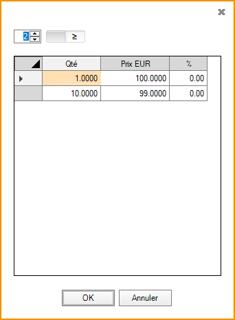 Une fois l'ensemble de ces adaptations effectuées, un bouton est présent sur chaque ligne de la grille de l'onglet "Fournisseurs" de la fiche "Articles". Il permet d'ouvrir une boîte de dialogue permettant de spécifier les prix par quantités pour cet article et ce fournisseur.