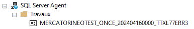 Mercator va ensuite tester la requête. Pour cela, il l'exécute dans une transaction qui fera toujours l'objet d'un rollback. Si la requête ne présente pas d'erreur, Mercator construira alors une procédure stockée qui contiendra ce script SQL. Le nom de cette procédure stockée débute toujours par SCHEDULED_SP_ et se termine par la même fin que le nom du travail/job soumis à l'agent. Tous deux peuvent être modifiés ou supprimés via les outils clients de SQL Server.