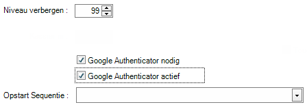 De checkbox "Google Authenticator vereist" moet aangevinkt zijn voor de gebruikers die de authenticatie met 2 factoren wensen te gebruiken. De checkbox "Google Authenticator actif" moet niet manueel aangevinkt worden. Het is automatisch aangevinkt indien de gebruiker zijn parameters voor Google Authentication zijn ingevuld. Men kan het veld uitvinken als de gebruiker van smartphone verandert, bijvoorbeeld.