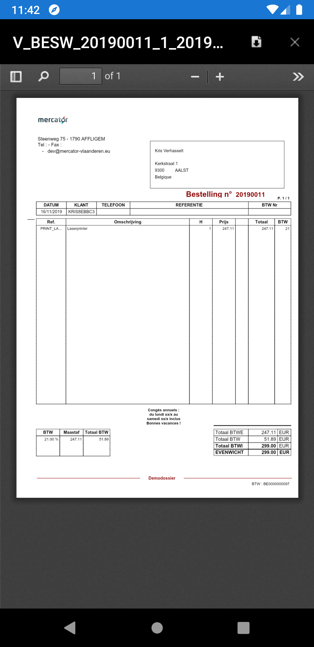 Deze bundel is bedoeld voor gebruik in combinatie met een Mercator-website. Het genereert een melding wanneer een bestelling gevalideerd wordt door een gebruiker op de website. Stap 2 biedt de mogelijkheid het PDF-duplicaat te bekijken en de details van de verkochte items te bekijken.