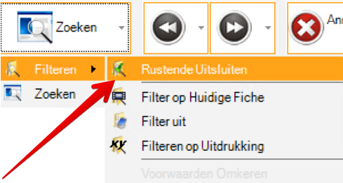 Via een nieuwe sub-knop genaamd "Rustende Uitsluiten" is het mogelijk om te beginnen met filteren door als eerste criterium de uitsluiting van alle rustende fiches aan te geven. Vervolgens kan u de overige velden invullen om uw filter uit te voeren zoals u al in het verleden deed.